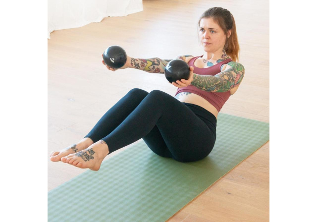 У пілатесі тонізувальні м’ячі з обтяженням часто використовуються для зміцнення рук, плечей і верхньої частини тіла.