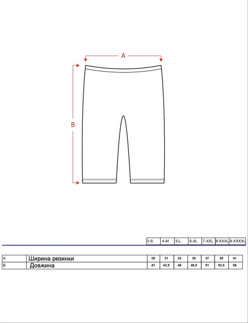 ЗАМІРИ (довжина резинки / висота трусів / бічний шов):S (31/23/41 ); M (33/25/44); L (34/26/46); XL (37/27/49); 2XL (37/27/51); 3XL (38/29/53); 4XL (40/30/56).