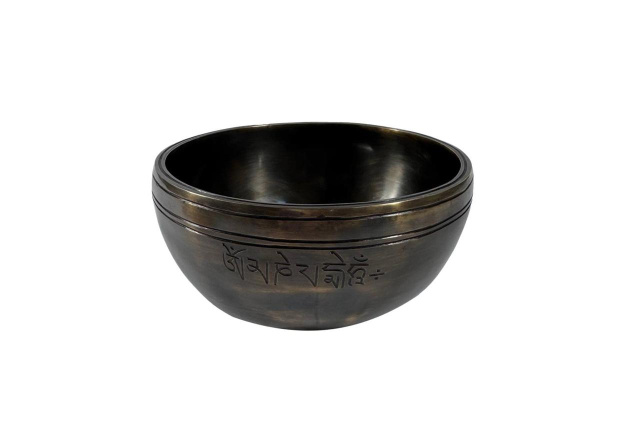 Товстостінна співаюча чаша діаметром 18,5 см, виготовлена вручну майстрами Непалу за традиційною технологією кування. Модель виготовлена в стилі Tiger Eye з характерним теплим переливом поверхні та прикрашена художньою різзю мантри «Ом Мані Падме Хум» і символу Удачі.