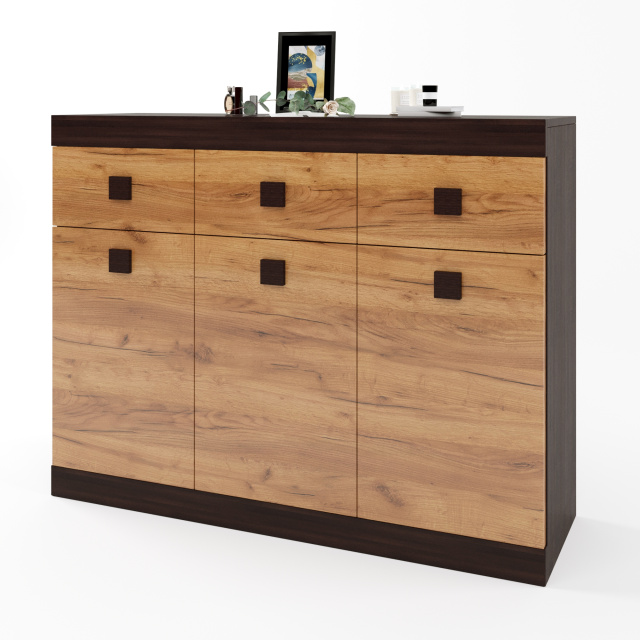 Откройте для себя идеальное сочетание элегантности и практичности с большим комодом Эверест. Его современный дизайн, выполненный в темном венге с элементами дуба крафт золотого, придаст вашему интерьеру роскошный вид. Три просторных ящика обеспечивают достаточно места для хранения всех ваших вещей, от одежды до аксессуаров, что делает его незаменимым элементом в любой комнате.