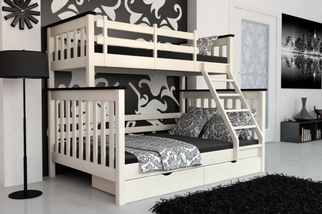 Кровать оснащена выдвижными ящиками для хранения белья и игрушек, имеет деревянный каркас из сосны и основание на ламелях, что обеспечивает правильную вентиляцию матраса и длительный срок эксплуатации. Подходит для матрасов размером 140×200 и 90×200 см (матрасы в комплект не входят).
