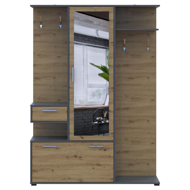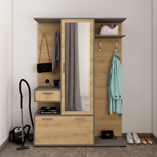 Откройте для себя элегантную прихожую Doros Финч, которая идеально сочетает функциональность и современный дизайн. Его изысканные линии и стильное сочетание цвета графита с дубом артизан придают вашему интерьеру нотки изысканности. Благодаря продуманным размерам, эта прихожая станет отличным дополнением к любому пространству, создавая уют и комфорт с первого взгляда.