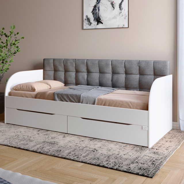 Кровать изготовлена из высококачественного ламинированного ДСП от Swiss Krono, что гарантирует долговечность конструкции и безопасность в использовании. Благодаря наличию ламелей, основание под матрас является ортопедическим, а два телескопических ящика подойдут для хранения игрушек, постельного белья или одежды.