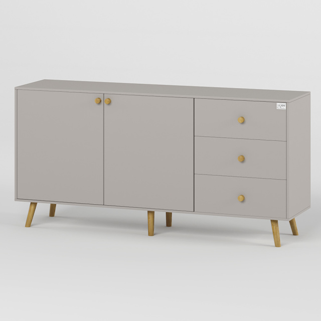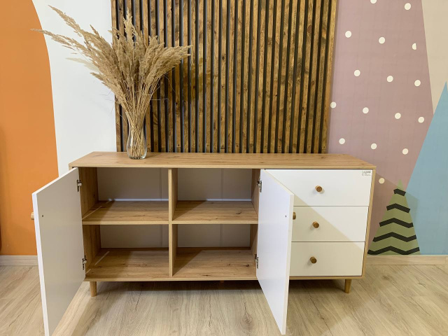 Корпус комода изготовлен из ламинированной ДСП, что обеспечивает надежность и стойкость к износу, а также легкость в уходе. Три выдвижных ящика и две дверцы позволяют удобно хранить различные вещи, а телескопические направляющие для ящиков гарантируют их плавное и бесшумное открытие.