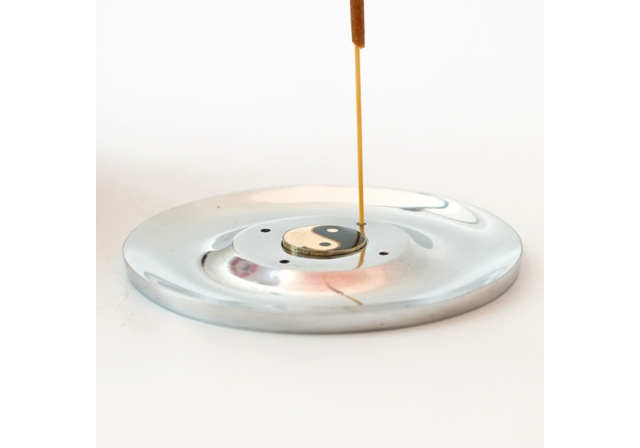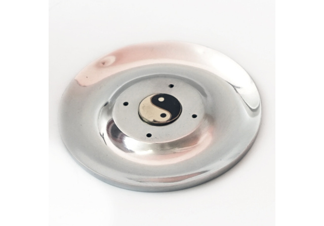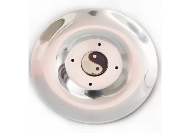 Металева підставка для пахощів у формі тарілки з символом Інь- Ян у центрі. Компактна та практична, вона допомагає безпечно використовувати аромапалички та конуси, захищаючи поверхню від попелу.